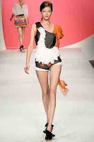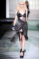 Just Cavalli has always been a bit like the goofy younger sister of the grown-up Cavalli label. Pasting an ‘I’ve just been touched by Cavalli’ slogan on the front of the opening look certainly suggested a designer indulging his slightly twisted sense of humour. This kind of self-referential fun will no doubt appeal to JC’s clearly defined target audience - carefree affluent young things will love the twenties-via-seventies flapper dresses.