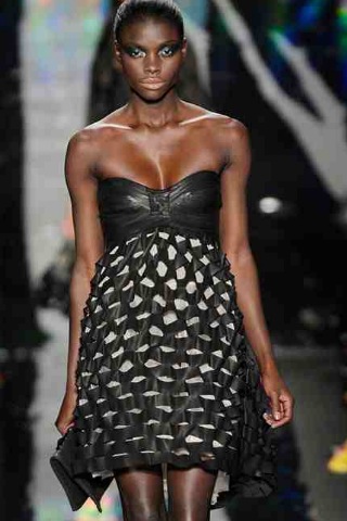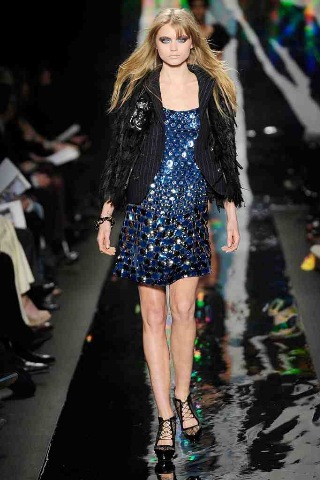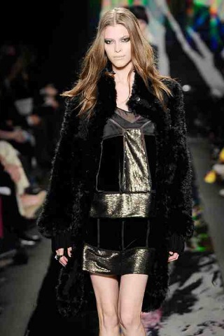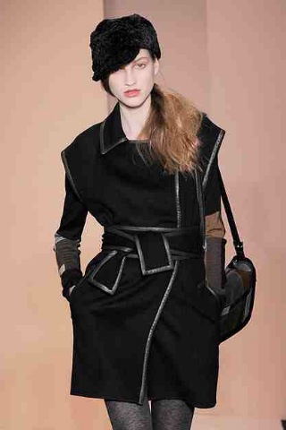 Oftentimes, DIANE VON FURSTENBURG seems to pinpoint a location with a collection, rather than a specific era or aesthetic, and while last season the giant sandy backdrop was an obvious clue to travel abroad, for Fall 2010 the oil slick-black catwalk denoted that she was firmly back in the city. Diane’s girl this season is an urbanite who likes to mix and match boyish separates in skyscraper colours with flippy, flirty dresses. She also loves to play with texture - velvet here, leather there, and, when out on the town, plenty sequins and shine.